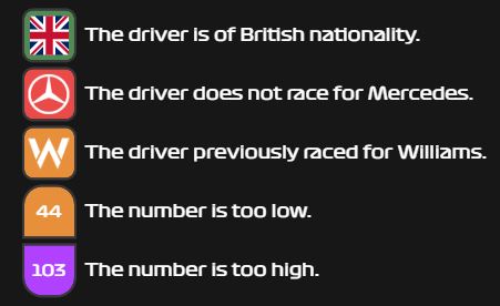 - Team Clue: A team logo (like Mercedes or Williams) reveals whether your guessed driver currently races for or has previously raced with that team.